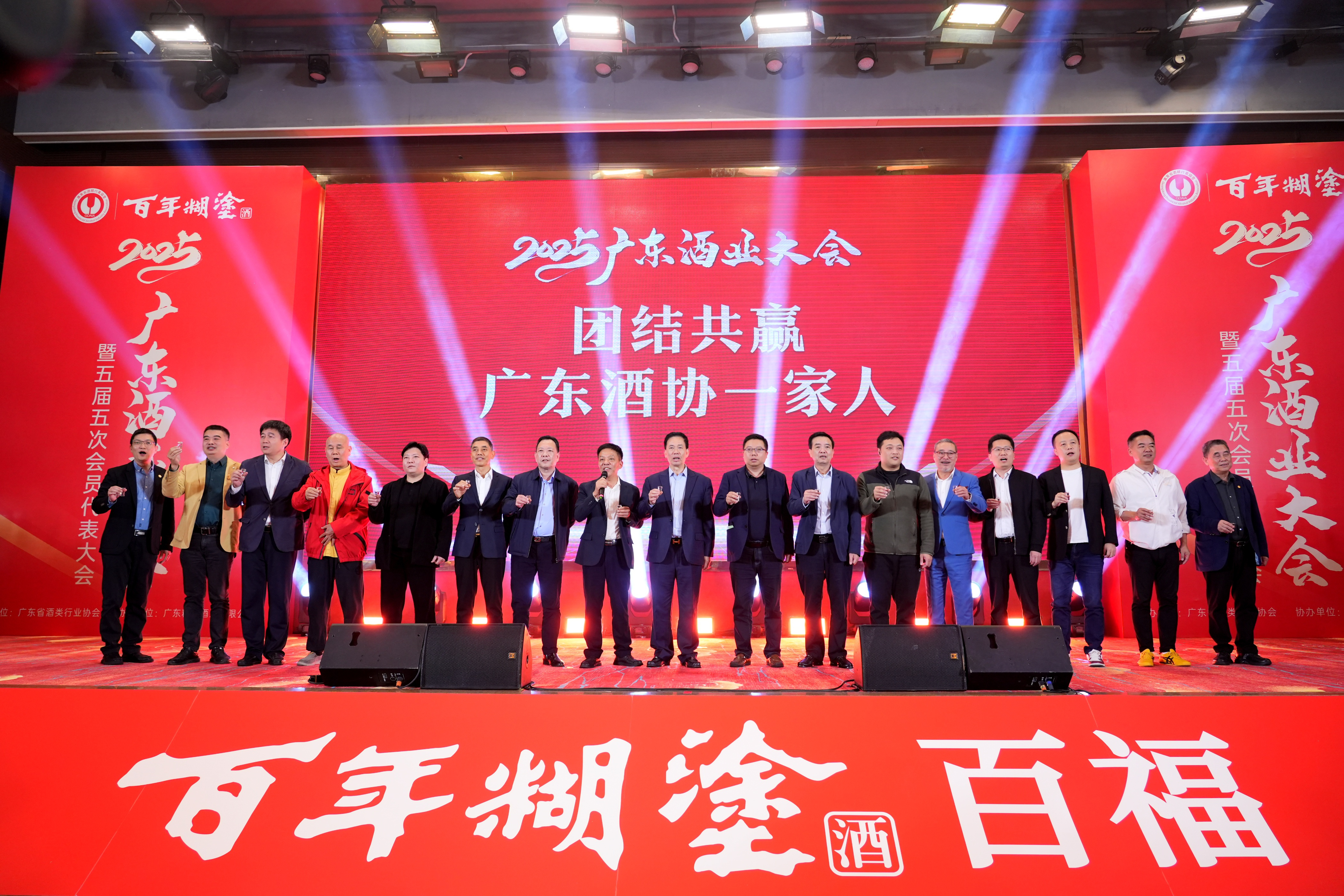 啟動(dòng)儀式后,廣東酒業(yè)協(xié)會(huì)的17位領(lǐng)導(dǎo)出席祝酒儀式,用百福6#共同舉杯,慶賀2025廣東酒業(yè)再接再厲,再創(chuàng)輝煌。